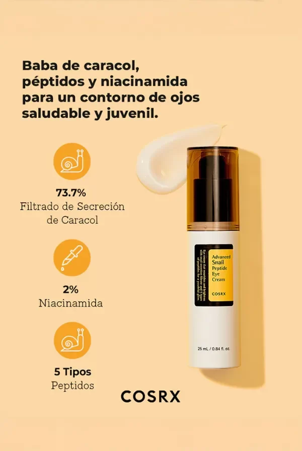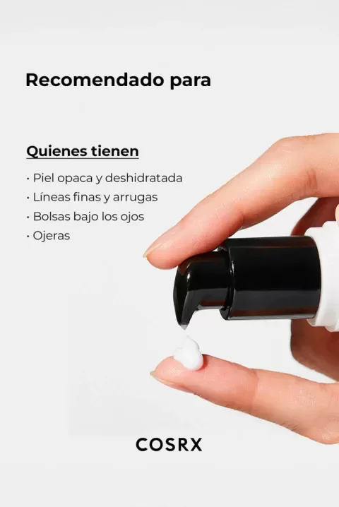 Crema para contorno de ojos con 72% de mucina de caracol y pentapéptidos. Tratamiento diario con gran poder reparador, regenerador y anti-age. Crema para el contorno de ojos hidratante de rápida absorción. Perfecta para quienes tienen desean enfocarse en el cuidado de líneas de expresión y los signos de envejecimiento, así como para quienes desean comenzar el la prevención cuidando el contorno de ojos a temprana edad. luminar visiblemente el área de los ojos Es uno de las últimas incorporaciones de COSRX en el mundo del contorno del ojo, con varias perlas y últimos avances de la cosmética incorporados en esta fórmula. Su fórmula muestra una textura de crema liviana con 3 funciones: Ayuda a disminuir la aparición de ojeras e hinchazón Actúa como reparador y antiage. Ilumina visiblemente el área de los ojos Esta delicada y pensada lista de ingredientes combinados trabaja restaurando y combatiendo los signos de la edad que aparecen en esta zona del rostro.