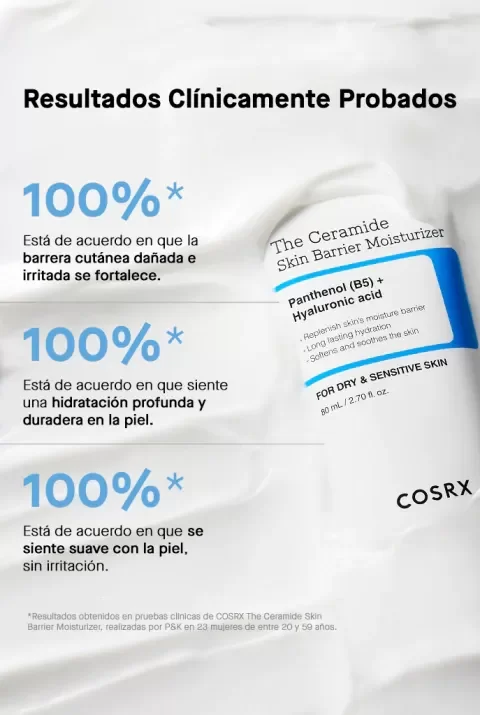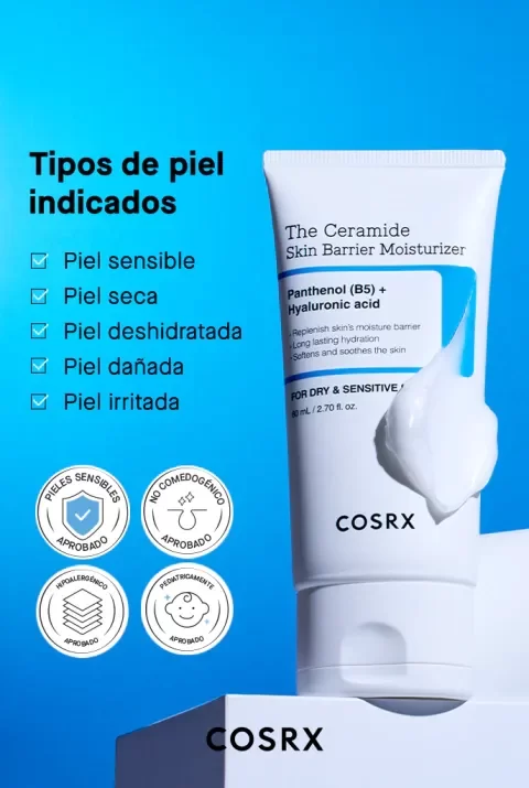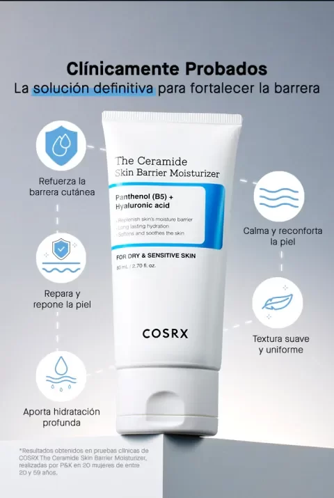 The Ceramide Skin Barrier Moisturizer de COSRX es una crema hidratante intensiva, que mejora el fortalecimiento de la barrera cutánea, hidrata profundamente y calma la piel sensible o dañada. Su fórmula ligera pero nutritiva está enriquecida con ceramidas. Especialmente formulado para pieles secas y sensibles. ¿Cómo aplicar COSRX Ceramide Moisturizer? Aplica una cantidad adecuada de COSRX The Ceramide Skin Barrier Moisturizer sobre el rostro limpio y tonificado, preferiblemente tras el sérum o la esencia. Masajea suavemente hasta su total absorción. Comprar COSRX The Ceramide Skin Barrier Moisturizer Online La crema COSRX The Ceramide Skin Barrier Moisturizer está formulada con un alto contenido en ceramida. Entre los activos principales se encuentran: Complejo de ceramidas: refuerzan la barrera protectora de la piel, calma y mantiene la hidratación. Betaína: hidratante natural que suaviza e hidrata la piel. Pantenol: hidratante, calmante y regenerador. Alantoína: alivia el picor y el enrojecimiento. Ácido hialurónico: otorga una intensa hidratación, mejorando la elasticidad y suaviza la textura de la piel. Ingredientes*: Water/Aqua, Butylene Glycol, Glycerin, Cetyl Ethylhexanoate, Butylene Glycol Dicaprylate/Dicaprate, Squalane, Pentaerythrityl Tetraisostearate, Dicaprylyl Carbonate, Behenyl Alcohol, Dimethicone, Betaine, Hydroxypropyl Bispalmitamide MEA, C14-22 Alcohols, Palmitic Acid, Stearic Acid, Hydroxypropyl Bislauramide MEA, Arachidyl Alcohol, Cholesterol, Polyacrylate-13, C12-20 Alkyl Glucoside, Allantoin, Arachidyl Glucoside, Caprylyl Glycol, Glyceryl Caprylate, Ethylhexylglycerin, Hydrogenated Polyisobutene, Carbomer, Tromethamine, Hydrogenated Lecithin, Dimethiconol, Cetearyl Alcohol, Polyglyceryl-10 Laurate, Ethylhexyl Palmitate, Sorbitan Isostearate, Phytosphingosine, Panthenol, Propanediol, Tocopherol, Ceramide NP, Sodium Hyaluronate, Ceramide NS, 1,2-Hexanediol, Hydrolyzed Hyaluronic Acid, Ceramide AP, Ceramide AS, Sodium Hyaluronate Crosspolymer, Hyaluronic Acid, Sodium Acetylated Hyaluronate, Ceramide EOP