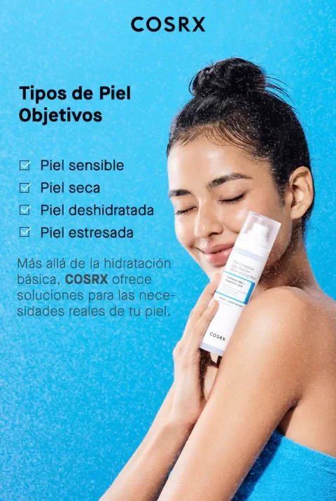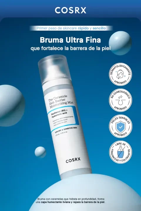 Rocía tu piel y disfruta de un aspecto más saludable con The Ceramide Skin Barrier Moisturizing Mist de COSRX. Con ceramidas, cinco tipos de ácido hialurónico y pantenol, este mist facial hidrata, calma y fortalece la piel en un solo paso. Su fórmula sin fragancia y no comedogénica es apta para todo tipo de piel, incluso la sensible. Úsalo como tónico en spray o aplícalo antes del maquillaje para preparar la piel y conseguir ese brillo jugoso. Por qué lo amamos: Es un mist facial sin complicaciones. Formulado con la tecnología híbrida de COSRX que mezcla perfectamente las distintas capas, no necesitas agitar la botella antes de usarla. Beneficios: - Este mist hidrata y calma la piel mientras ayuda a fortalecer la barrera cutánea. - Enriquecido con ceramidas, colesterol, ácidos grasos, NMF y ácido hialurónico para reparar la barrera dañada y aportar hidratación profunda. - Su fórmula suave calma al instante la piel irritada y seca, mejorando el enrojecimiento. - La textura ligera se absorbe rápidamente mientras nutre la piel en profundidad sin dejar sensación pegajosa. Modo de empleo: - Rocía sobre el rostro a una distancia de 20–30 cm con los ojos cerrados y da toquecitos suaves para mejorar la absorción. - Úsalo en cualquier momento cuando notes la piel seca.