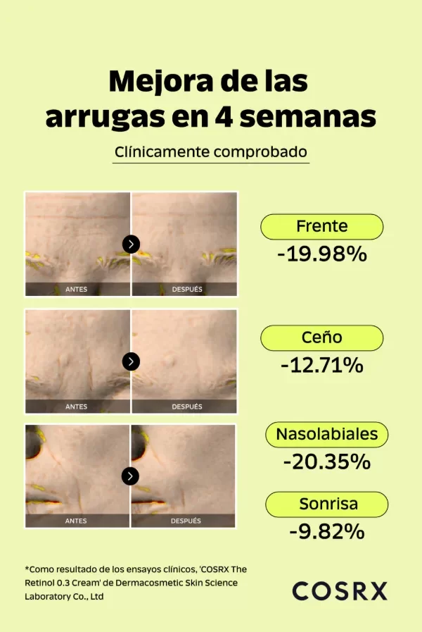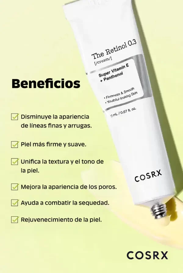 Beneficios: Una crema facial con 0.3% de retinol puro para mejorar la apariencia de arrugas. Caracterizada por el super Vitamina E y Adenosina que ayuda a reducir las señales visibles de la edad y el daño. Contiene Ácido Hialurónico, Pantenol y Alantoína que hidrata y calma la piel. Clínicamente probado para mejorar el levantamiento facial, aumentar la elasticidad de la piel y abordar preocupaciones como poros, arrugas y piel propensa al acné. Modo de empleo: Aplica una cantidad apropiada en las zonas afectadas y gentilmente masajea para ayudar a la absorción. Ingredientes principales Water, Caprylic/Capric Triglyceride, Butylene Glycol, Glycerin, Glycine Soja (Soybean) Oil, Tocopherol, Tocopheryl Acetate, Cetearyl Alcohol, Trehalose, Panthenol, Butyrospermum Parkii (Shea) Butter, Ammonium Acryloyldimethyltaurate/VP Copolymer, Dimethicone, Glyceryl Polymethacrylate, Polyglyceryl-10 Stearate, Hydrogenated Lecithin, Helianthus Annuus (Sunflower) Seed Oil, Hydroxyethyl Acrylate/Sodium Acryloyldimethyl Taurate Copolymer, Carbomer, Retinol(0.3%), Tromethamine, Glyceryl Stearate, Polysilicone-11, Sodium Sulfite, Daucus Carota Sativa (Carrot) Root Extract, Allantoin, Glyceryl Caprylate, Propanediol, Oryza Sativa (Rice) Bran Wax, Tocotrienols, Stearic Acid, Polyglyceryl-3 Methylglucose Distearate, Palmitic Acid, Ethylhexylglycerin, Disodium EDTA, Adenosine, Sodium Hyaluronate, Sorbitan Isostearate, 1,2-Hexanediol, Elaeis Guineensis (Palm) Oil, Hydrolyzed Hyaluronic Acid, Beta-Carotene, Sodium Hyaluronate Crosspolymer, Myristic Acid, Hyaluronic Acid, Lauric Acid, Sodium Acetylated Hyaluronate, Ascorbic Acid, Limnanthes Alba (Meadowfoam) Seed Oil, 3-O-Ethyl Ascorbic Acid, Glutathione